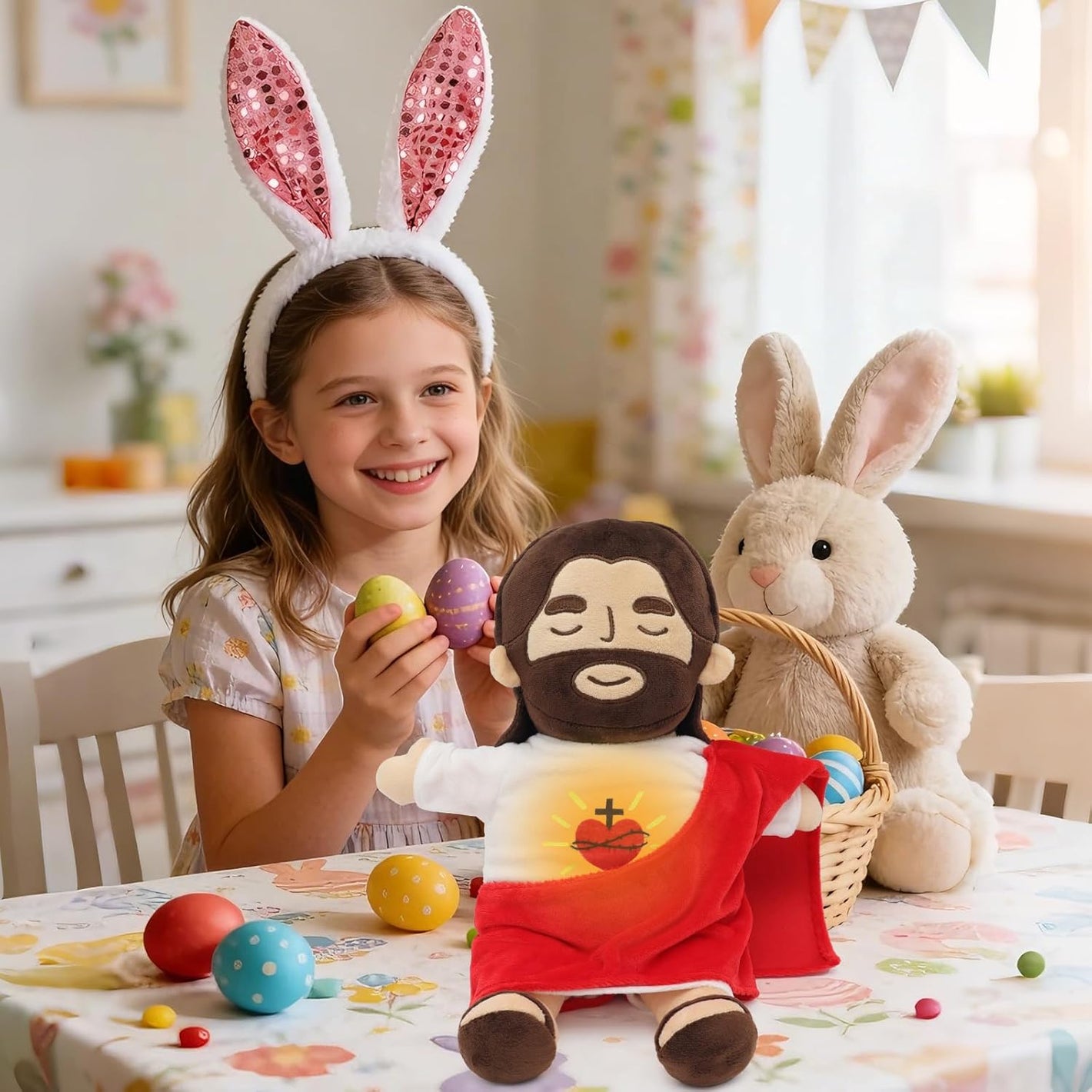The Jesus plush simulates a gentle, rhythmic breathing motion to provide a calming, comforting experience for children during naptime or prayer. It's crafted from high-quality, soft polyester filling and is designed to be a safe, cuddly guardian that watches over your little ones as they sleep.